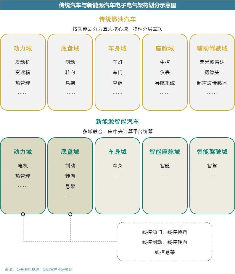传统汽车按照功能将车辆的电子电气架构划分为动力域、底盘域、座舱域、车身域和辅助驾驶域;新能源汽车虽然对电子电气架构做了重新整合,但大致的功能划分区别不大。