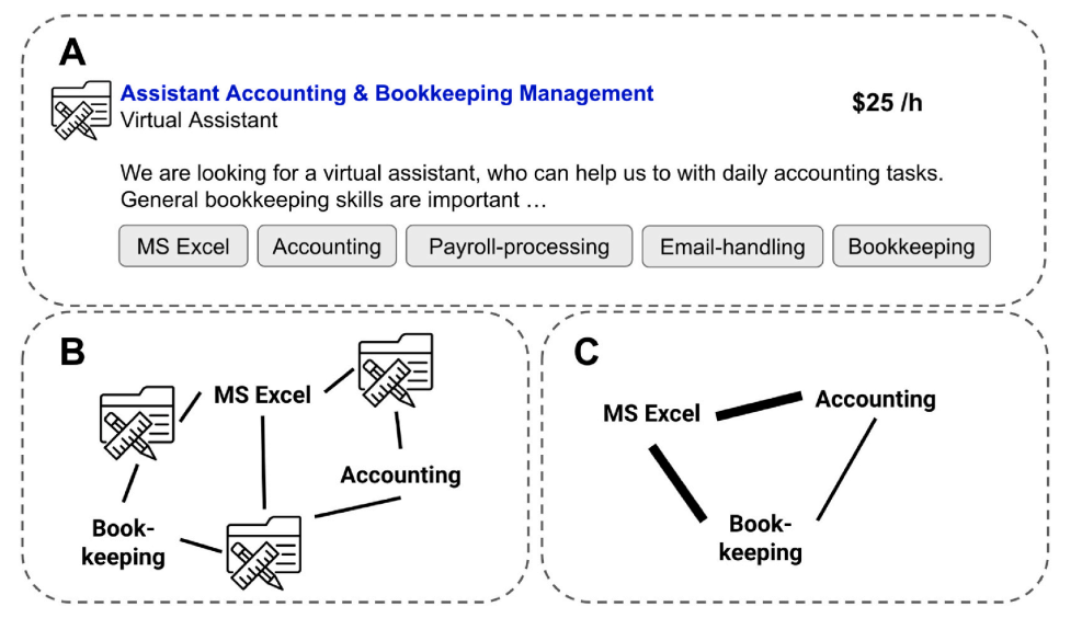我们采用网络分析方法对技能之间的关系进行概念化。数据包含 2014 至 2022 年间发布的49,884 个自由职业项目样本,这些项目由25,170 名美国工作者完成,涉及多维度技能需求。我们将分析限定于美国工作者,以减少因国家间结构差异(如本地物价水平)和其他未观测到的异质性导致的工资差异。我们将 “技能”(skill) 定义为工作者执行特定工作任务所需的能力(Nedelkoska et al, 2019)。