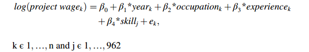每个项目的时薪(以美元计)使我们能够通过统计方法评估个体技能的价值。我们采用 Alekseeva 等人(2021)提出的回归方法计算技能溢价,具体通过962 个线性回归模型(每项技能对应一个模型)分析以下变量对项目时薪的影响: