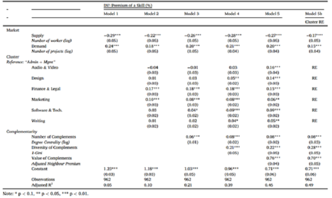 模型 3表明技能价值与互补技能数量呈正相关;模型 4引入互补技能多样性后显示,多样性越高的技能价值越高;模型 5进一步验证了互补技能价值的正向影响。模型 5b通过随机效应面板模型控制技能社区差异,结果显示:互补性对技能价值的影响至关重要,同时供需因素仍显著 —— 工作者数量每增加 1%,技能价值下降 27 个百分点;需求每增加 1%,技能价值提升 20 个百分点。