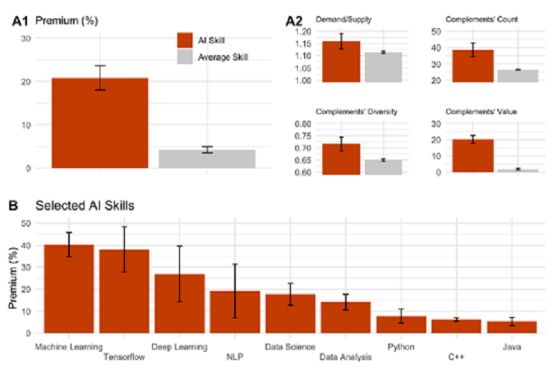 图 A 显示,人工智能技能具有特殊性:其溢价为 21%,远高于样本中的技能平均溢价(4%)。进一步细分分析(图 B)显示,不同人工智能技能的价值存在显著差异:机器学习(40%)、TensorFlow(38%)、深度学习(27%)、自然语言处理(19%)等技能的溢价高于数据分析(14%)和数据科学(17%),而用于构建人工智能的主流编程语言(如 Python(8%)、C++(7%)、Java(5%))的溢价则更低。