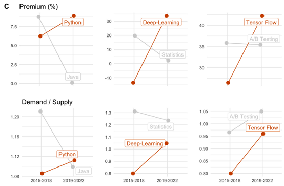 图C对比了 2015-2018 年与 2019-2022 年两个时期特定定技能的溢价。以 Python 和 Java 这两种流行编程语言为例,尽管二者在 2015-2019 年的溢价大致相同,但随后呈现不同走势:Java 的溢价显著下降,而 Python 的市场价值上升。这一趋势的驱动因素可能是受欢迎程度的变化 —— 过去十年间,Python 已崛起为数据科学的核心技能(Grus, 2019),而 Java 则不然(供需对比见下图)。深度学习领域的人工智能技能也呈现类似逻辑:图 B 和 C 显示,深度学习和 TensorFlow(深度学习编程中最常用的软件环境之一)的溢价在过去十年显著上升,而统计学和 A/B 测试等传统统计应用技能的价值则停滞不前。与编程语言的情况类似,自由职业者样本显示,深度学习和 TensorFlow 的需求 - 供给比相对于统计学和 A/B 测试显著增加。